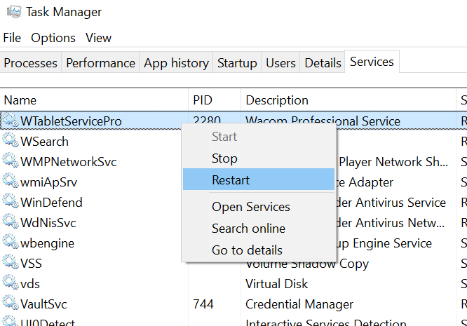 Đa phần những hướng dẫn đều xoay quanh việc tái khởi chạy dịch vụ mang tên “wtabletservicePro” như hình bên dưới: